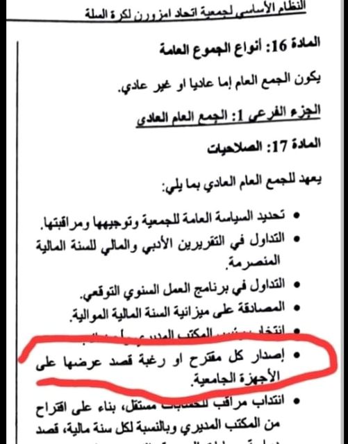 رغم ان النظام الأساسي لجمعية اتحاد إمزورن لكرة السلة واضح من حيث اصدار مقترح و عرضه غلى الاجهزة الجامعية الا بقرار من الجمع العام،و مراسلة الجامعة الملكية لكرة السلة في قضية كهذه يجب أن تناقش في أشغال الجمع العام، أو على الأقل الإعلان عن جمع عام استثنائي ليخرج منه هكذا قرار.