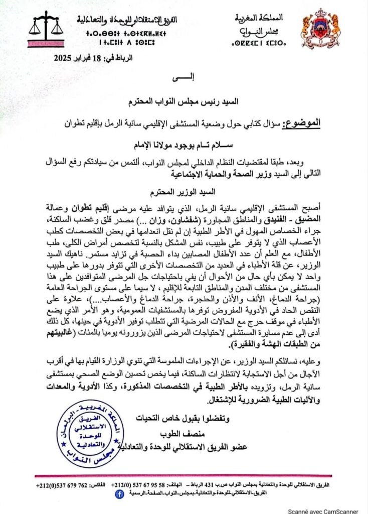 وجه البرلماني عن دائرة تطوان السيد منصف الطوب سؤالا كتابيا للسيد وزير الصحة والحماية الاجتماعية حول وضعية المستشفى الاقليمي سانية الرمل بتطوان، حيث اكد الطوب ان الوضعية تدعو الى القلق من جراء النقص الحاصل في الأطر الطبية وشبه الطبية والإدارية مما يعمق من معاناة المرضي المتوافدين على هذا المستشفى من مختلف المناطق : عمالة المضيق الفنيدق، شفشاون وزان وغيرها من الأقاليم.