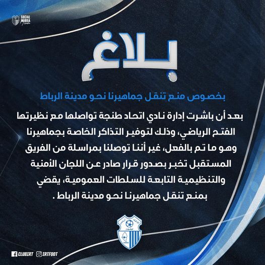 اصدر نادي اتحاد طنجة لكرة القدم بلاغا اخباريا لجماهيره يعلن من خلال عدم السماح للجماهير الطنجاوية بالتنقل لمدينة الرباط قصد مؤازرة الفريق في مقابلته ضد الفتح الرياضي الرباطي، و ذلك من خلال الجولة 11 من البطولة الوطنية الاحترافية.