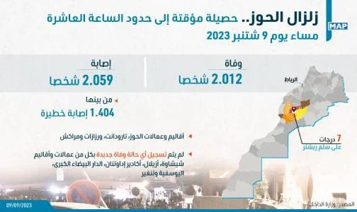 أعلنت وزارة الداخلية، في حصيلة محينة للهزة الأرضية التي شهدتها بعض عمالات وأقاليم المملكة، مساء أمس الجمعة، أن عدد الوفيات بلغ إلى حدود الساعة العاشرة من مساء اليوم، 2012 شخصا، وعدد الجرحى 2059، حالة 1404 منهم خطيرة.
