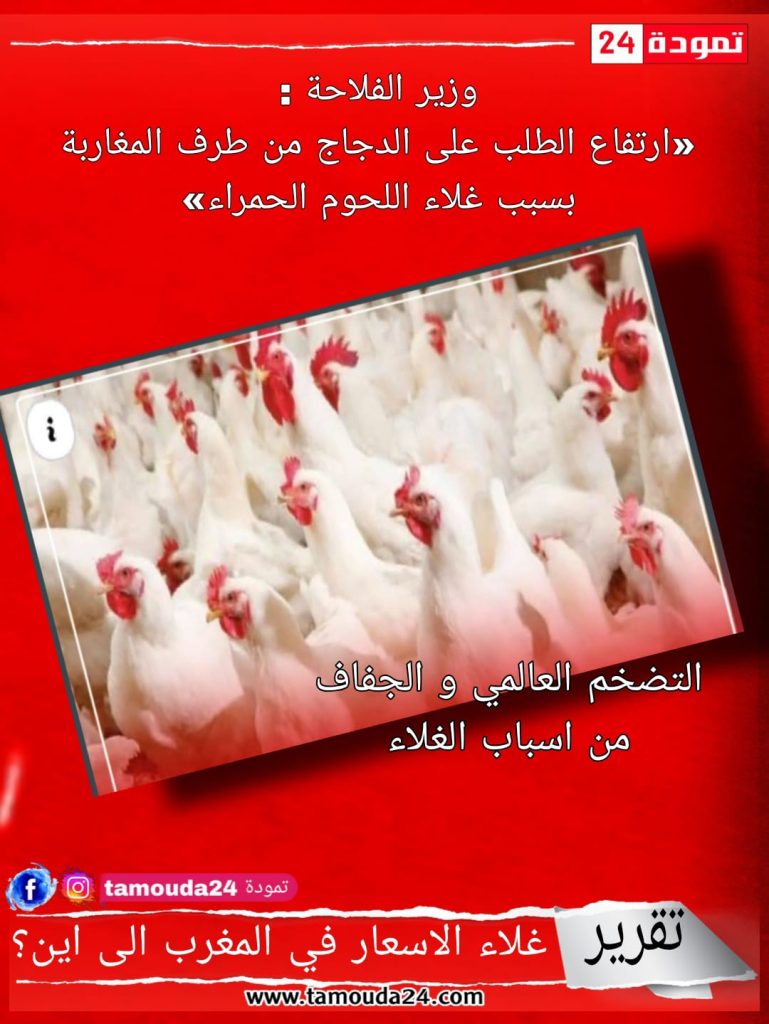 خلال جلسة الأسئلة الشفهية بمجلس النواب قال وزير الفلاحة إن الأمر يعود لارتفاع الطلب على الدجاج من طرف المغاربة بسبب غلاء اللحوم الحمراء. في جواب على تبريرات الفيدرالية البيمهنية لقطاع الدواجن (FISA) لتفسير الغلاء الذي طال أسعار الدواجن ببلادنا.