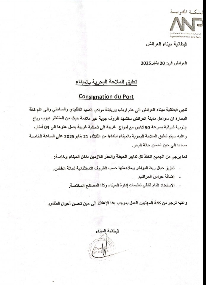 هذا الامر جعل من عملية الملاحة من والى ميناء العرائش تشكل خطرا على ارواح البحارة والمهنيين ، وطلبت من الجميع الامتثال لقرار منع الابحار الى حين صدور قرار آخر.