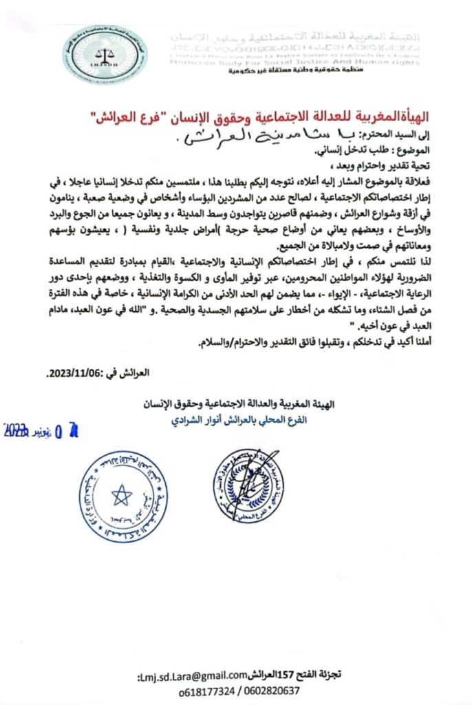 وتأسيسا لما سبق ذكره ، التمست الهيأة الحقوقية بالعرائش من الجهات المعنية والسلطات ،بالتدخل الإنساني العاجل ، وفق اختصاصاتهم الاجتماعية ، لصالح عدد من المشردين البؤساء واشخاص في وضعية صعبة ، ينامون في أزقة و شوارع العرائش ، ضمنهم قاصرين يتواجدون وسط المدينة ، ويعانون من البرد والأوساخ ، وبعضهم يعاني من أوضاع صحية حرجة (أمراض جلدية ونفسية) ، يعيشون بؤسهم ومعاناتهم في صمت ولا مبالاة من الجميع ، بل تخلت عنهم بعض الجمعيات التي كانت تنشط في مجال الخرجات الليلة الخيرية للتخفيف المعاناة عليهم ).