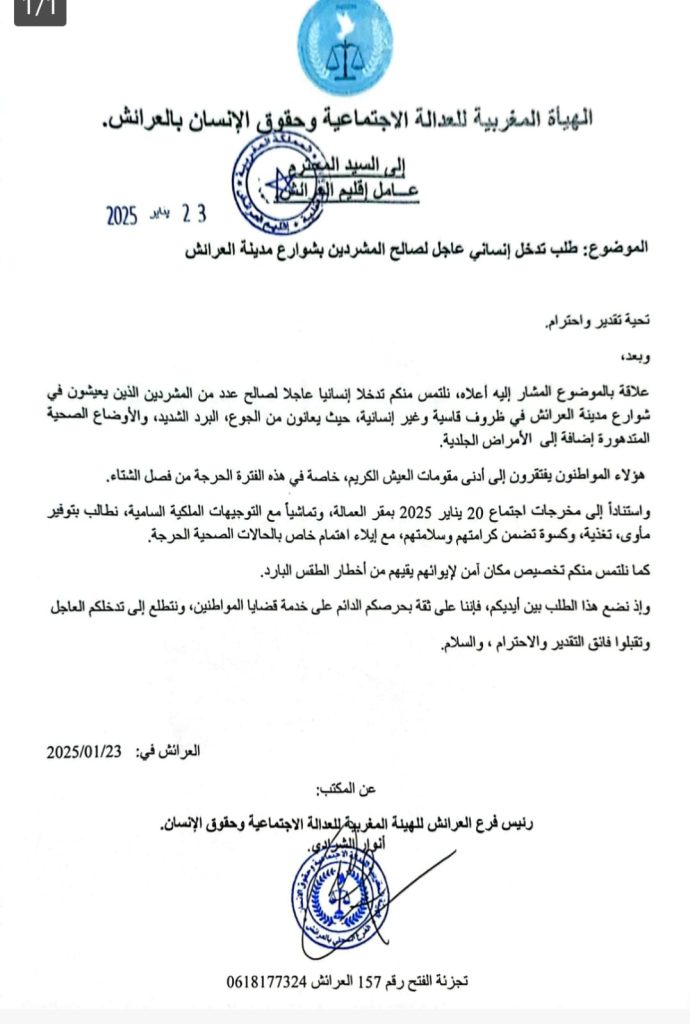في ظل موجة البرد القارس التي تضرب مدينة العرائش وإقليمها، وجه الفرع المحلي للهيأة المغربية للعدالة الاجتماعية وحقوق الإنسان مراسلة رسمية (تتوفر تمودة 24 على نسخة منها ) إلى السيد عامل إقليم العرائش والسيد باشا المدينة بتاريخ 23 يناير 2025،حيث تضمنت دعوة للتدخل العاجل لإنقاذ من لا مأوى لهم من المشردين الذين يعيشون أوضاعا كارثية، وذلك تنفيذاً للتعليمات الملكية المتعلقة بحماية الفئات الهشة والمتضررة من الظروف المناخية القاسية.