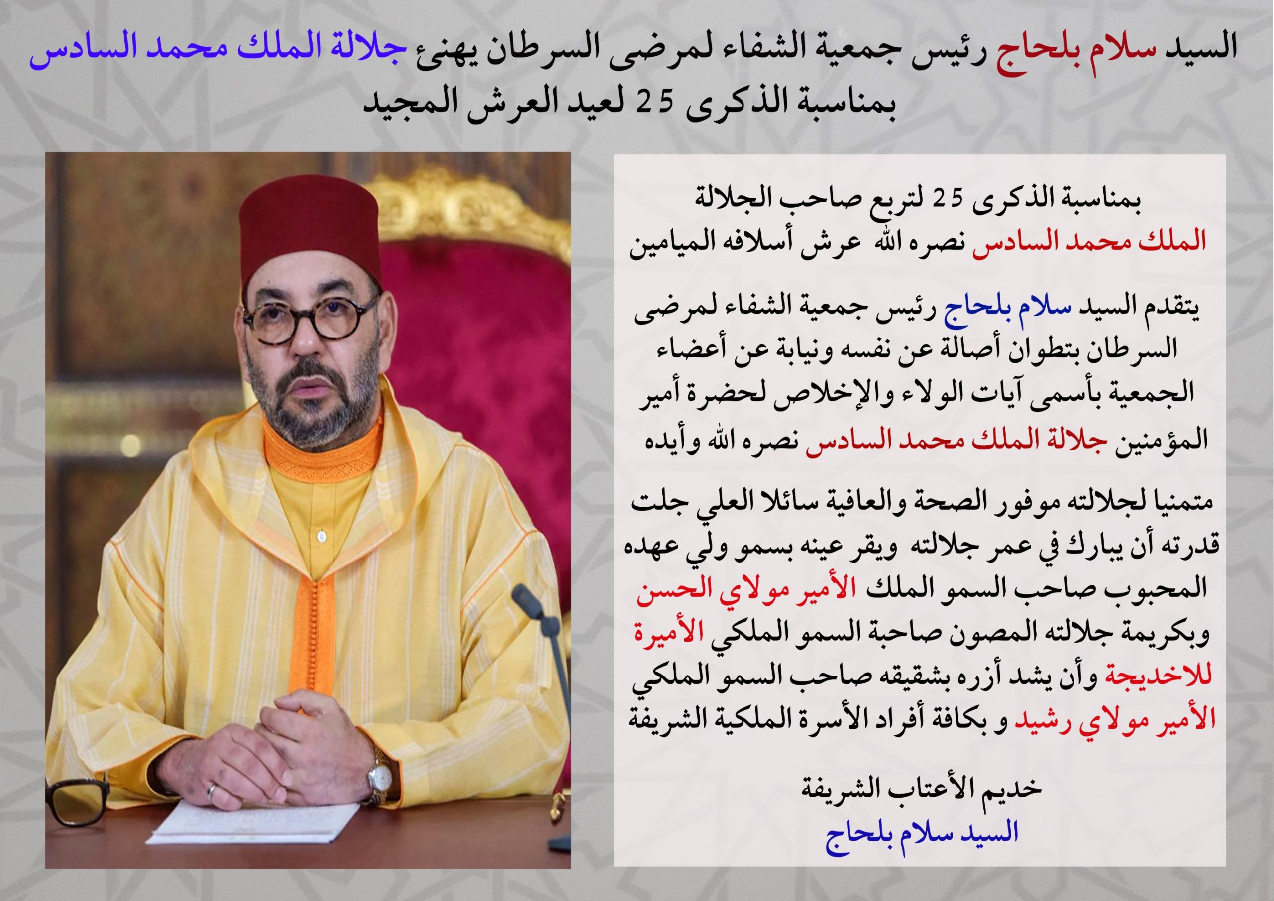 رئيس جمعية الشفاء لمرضى السرطان سلام بلحاج يهنئ جلالة الملك بمناسبة عيد العرش