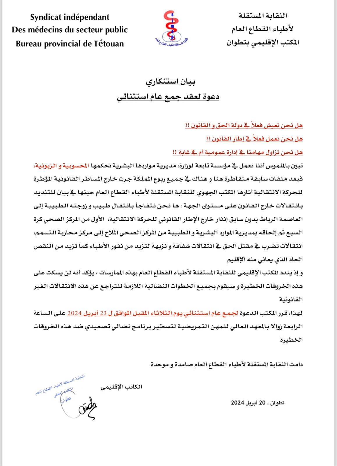 بلاغ ناري من المكتب الإقليمي بتطوان للنقابة المستقلة لأطباء القطاع العام